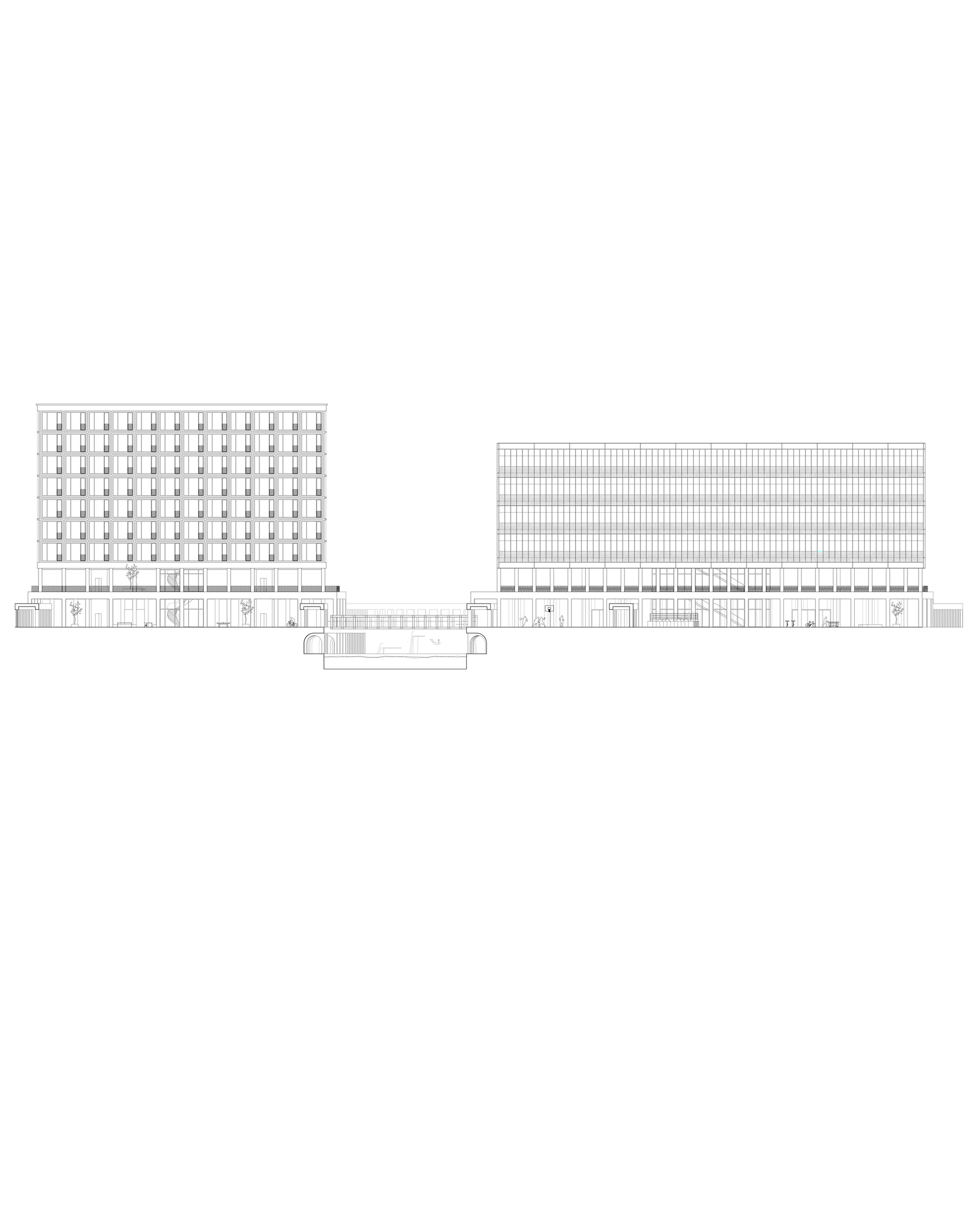 ︎︎︎Valentin Moser + Bernhard Ogrisek design a residential, sports, and recreational park in the Wetzelsdorf district on the outskirts of Graz. The park of “Schloss Eggenberg” and the Austrian Sculpture Park were studied as examples of sophisticated landscape design. The site was investigated through "typological design" that involved intersecting, scaling, transforming, and layering Durand’ian prototype designs for public buildings with sports and swimming facilities, followed by superimposing urban-dense residential uses on and around the sports facilities. These uses blend in the designs to form trompe-l'œil-like compositions of historical and contemporary forms and elements, incorporating standardized sports facilities, sculptural open spaces, recreational offerings, and varied interconnections and separations of indoor and outdoor spaces …