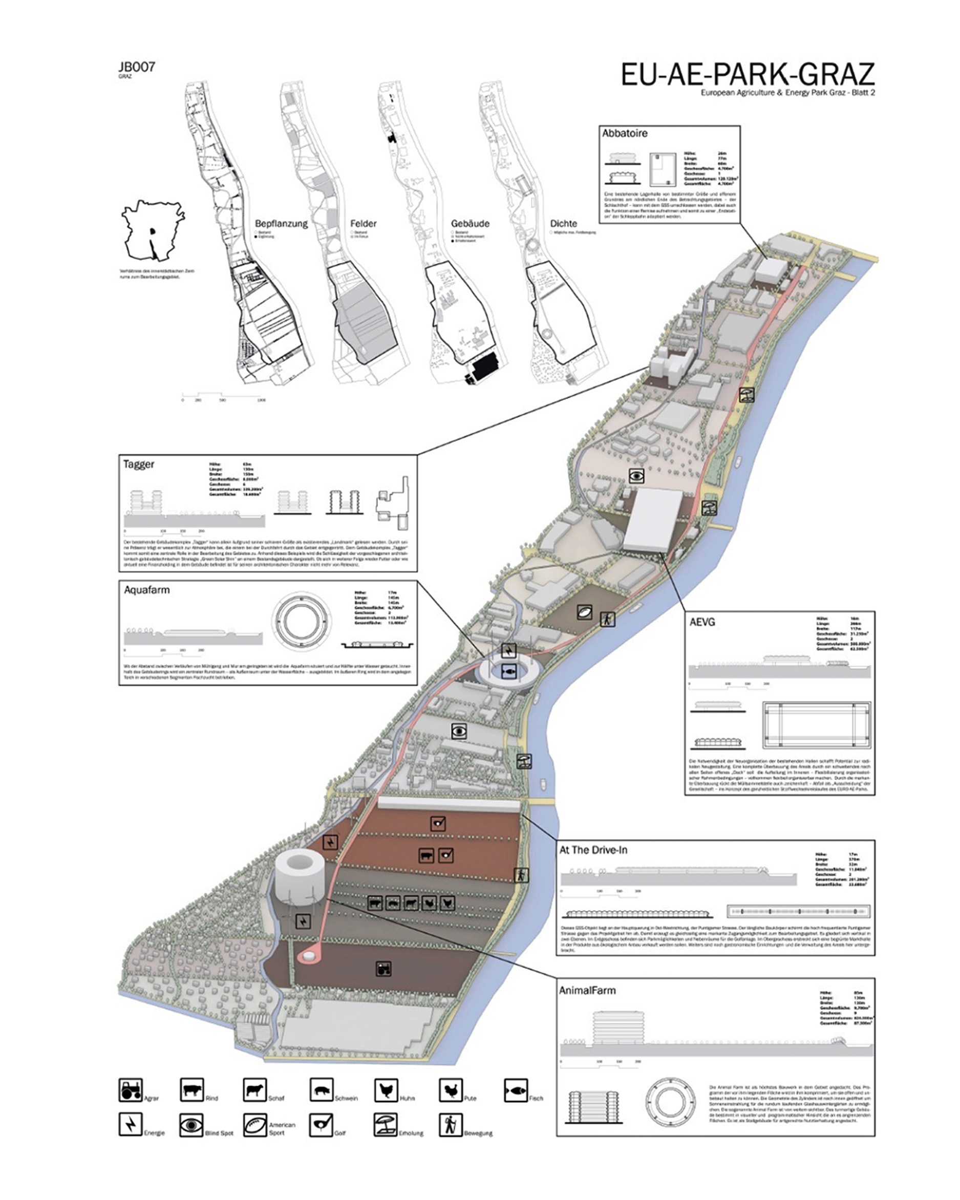 “The project introduces a clear and strong strategy of evaluating the area as a promising future, a new model for peripheral areas which suffer from an overall lack of structural qualities, are characterized by a diffused landscape and an absolute absence of identity. The idea is to develop a characeristic new spatial setting which we could see as a „productive landscape“ entering a specific dialogue with buildings: being a significant, large-scaled object each building provides a specific programme which is strongly linked to the productive landscape, using and shaping its qualities. At the same time these specific buildings share the same skin, thus introducing a serial mode of sequential appearances along the longitudinal development of the landscape: the heterogeneity of the area meets the homeogeneity of the skin, provoking an attractive tension between similarity and difference. The Mur river as the one identifying element thus finds its correspondence in the overall study area which – territorially – develops to a new species, an interesting pilot-model for suburban areas where landscape closely intertwines with large scale production, integrating agricultural, industrial, an recreational uses. Although the large scale of the project does not seem to respect the context of the fragmented ownership structures, the strategy clearly addresses the pattern of the parcels creating different „fields“ of intervention in which the specific programmatic scenarios can take place. The suggested programs range from agricultural animal farms to recreational drive- in buildings. The jury discusses the apropriateness of size and programme in relation to the demands of an intelligent urban strategy. Parts of the jury do not see any viable strategy behind the seductive images which tell about the poetic relationship between landscape and object. Another part of the jury exactly sees in the configuration of large scale developments in synergy with an open landscape a very high strategic potential: by providing a concept for a very strong identity, issues such as traffic infrastructure, interdisciplinary synergies, programmatical appropriateness and landscape development are secondary structures whose further development can be easily negotiated and adapted in the future process without loosing the quality of the concept.”